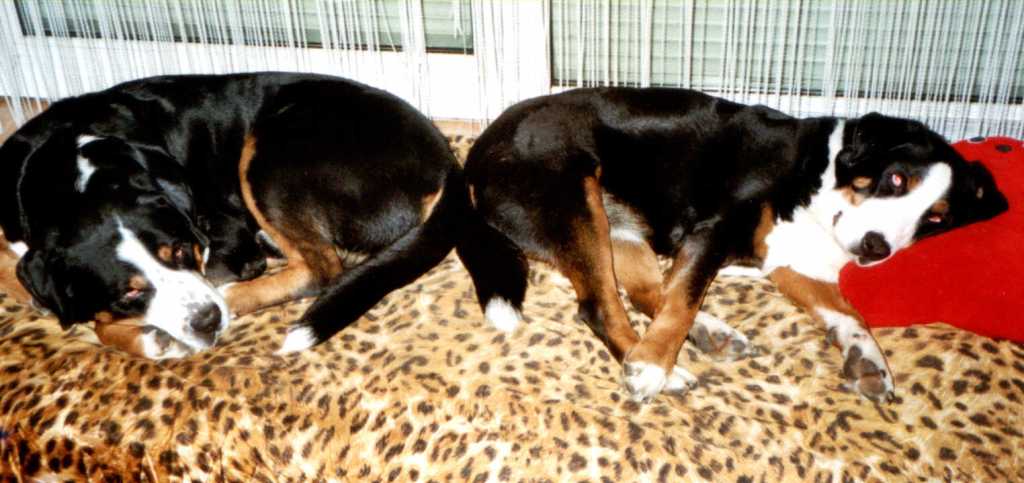 Deshalb hatten wir uns überlegt: Ein Zweithund musste her! Der sollte ihr auch außerhalb des Grundstückes Sicherheit geben. Wir wussten aber auch: NIE WIEDER EIN HUND AUS SOLCHEN VERHÄLTNISSEN! Wir schauten also regelmäßig auf die Homepage des Schweizer Sennenhund-Vereins. Und dann fand ich IHN in der Notvermittlung: GSS-Rüde, Grunderziehung vorhanden, lebt mit Familie in Haus und Garten. Der Rüde war 1 ½, also gerade ein halbes Jahr jünger als unsere Hündin. Passt! Ein Anruf und anschließend ein Besuch. Wir durften ihn gleich mitnehmen: Ben vom Bergmannshaus – genannt Paul oder Paulchen Panther. Er fühlte sich bei uns sofort zu Hause. Er war gerade aus dem Auto heraus, schon bewachte er unser Grundstück. Er war furchtbar laut. Ein Kraftpaket. Sehr selbstbewusst. Genau das, was wir brauchten???