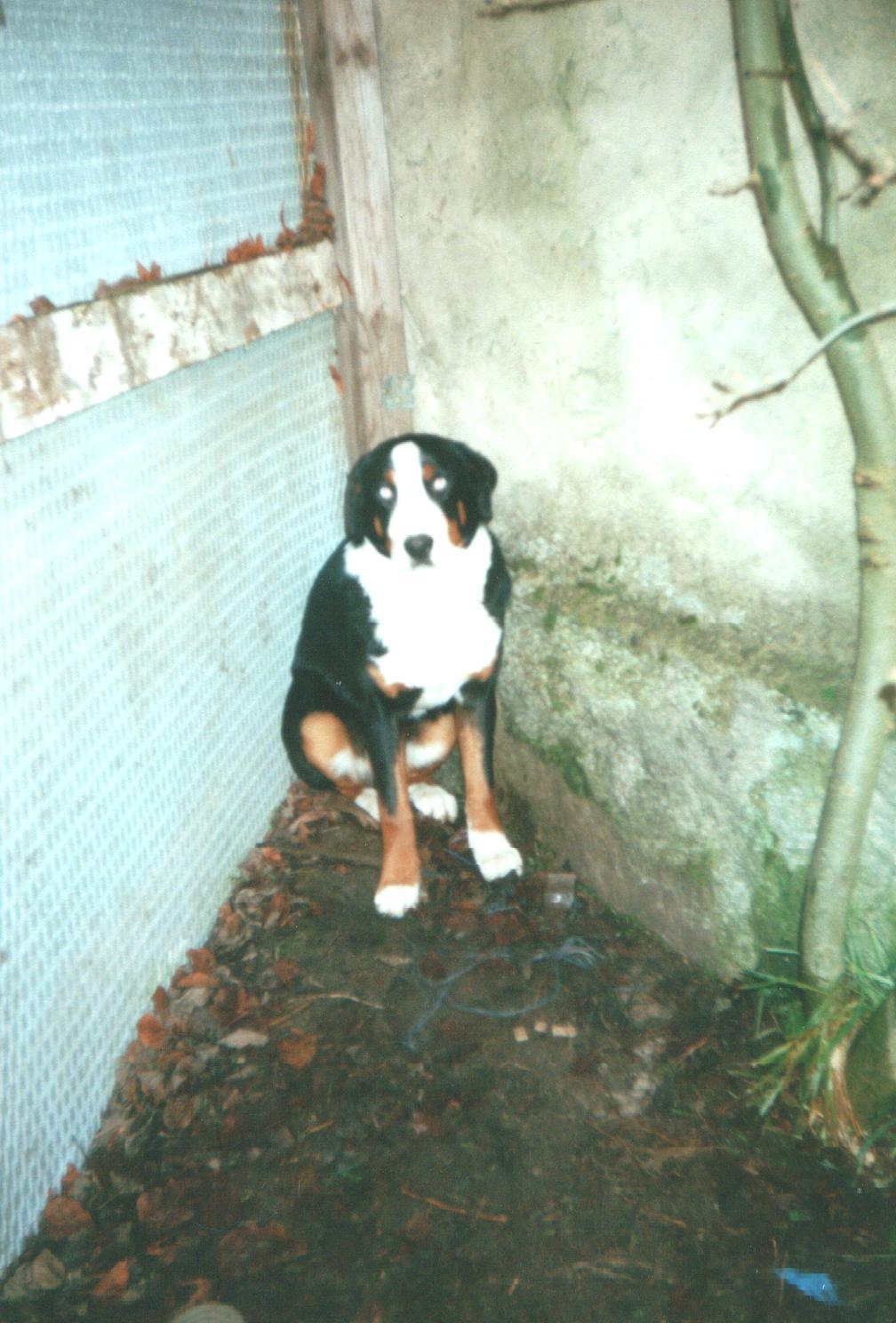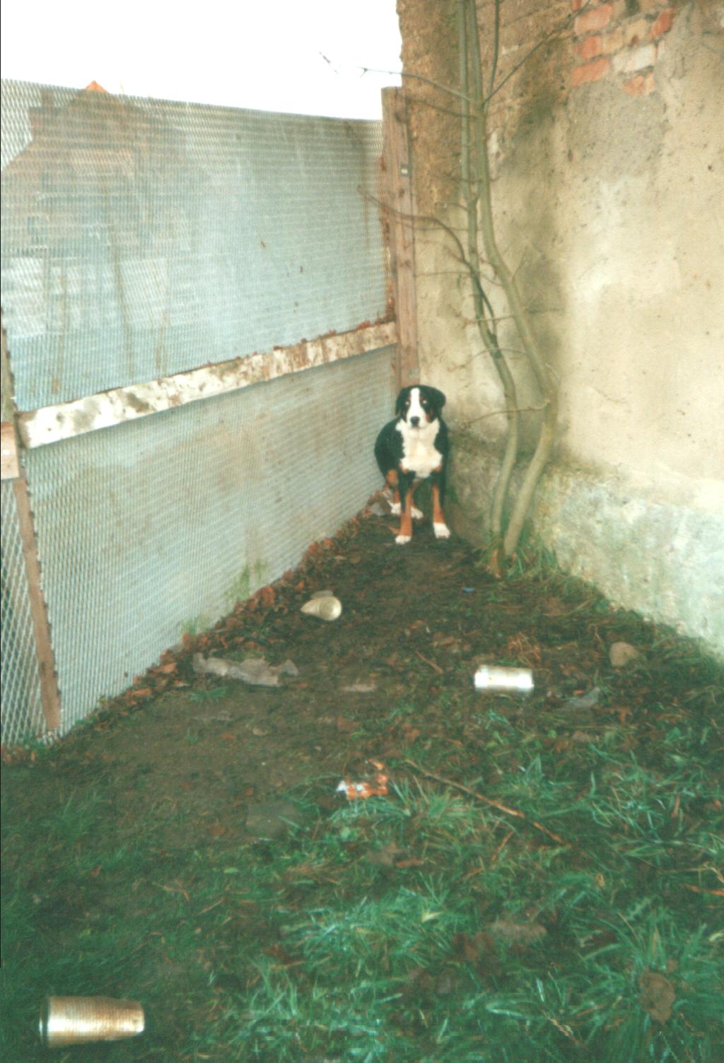 Ich wollte diesen Hund nicht haben, der noch nicht einmal nach einem Großen Schweizer aussah. Aber mein Mann und meine beiden Söhne wollten diese arme Kreatur unbedingt mitnehmen. Ich war überstimmt, ahnte aber nichts Gutes. Wir vereinbarten, dass wir sie eine Woche später abholen. Und das wider meines besseren Wissens. Wir wollten erst einen Zwinger bauen, denn wir kannten es von all unseren Nachbarn nicht, dass die Hunde mit im Haus leben durften. Höchstens die Kleinen in den Neubauten. Wir holten unsere Hündin dann wie vereinbart ab. Es war ein reiner Mitleidskauf. Ich weiß – so etwas sollte man NIEMALS tun! Wir haben damit diese Vermehrerin unterstützt und dafür gesorgt, dass von ihr weitere Welpen so erbärmlich nachproduziert werden konnten. Es war Februar 2001.