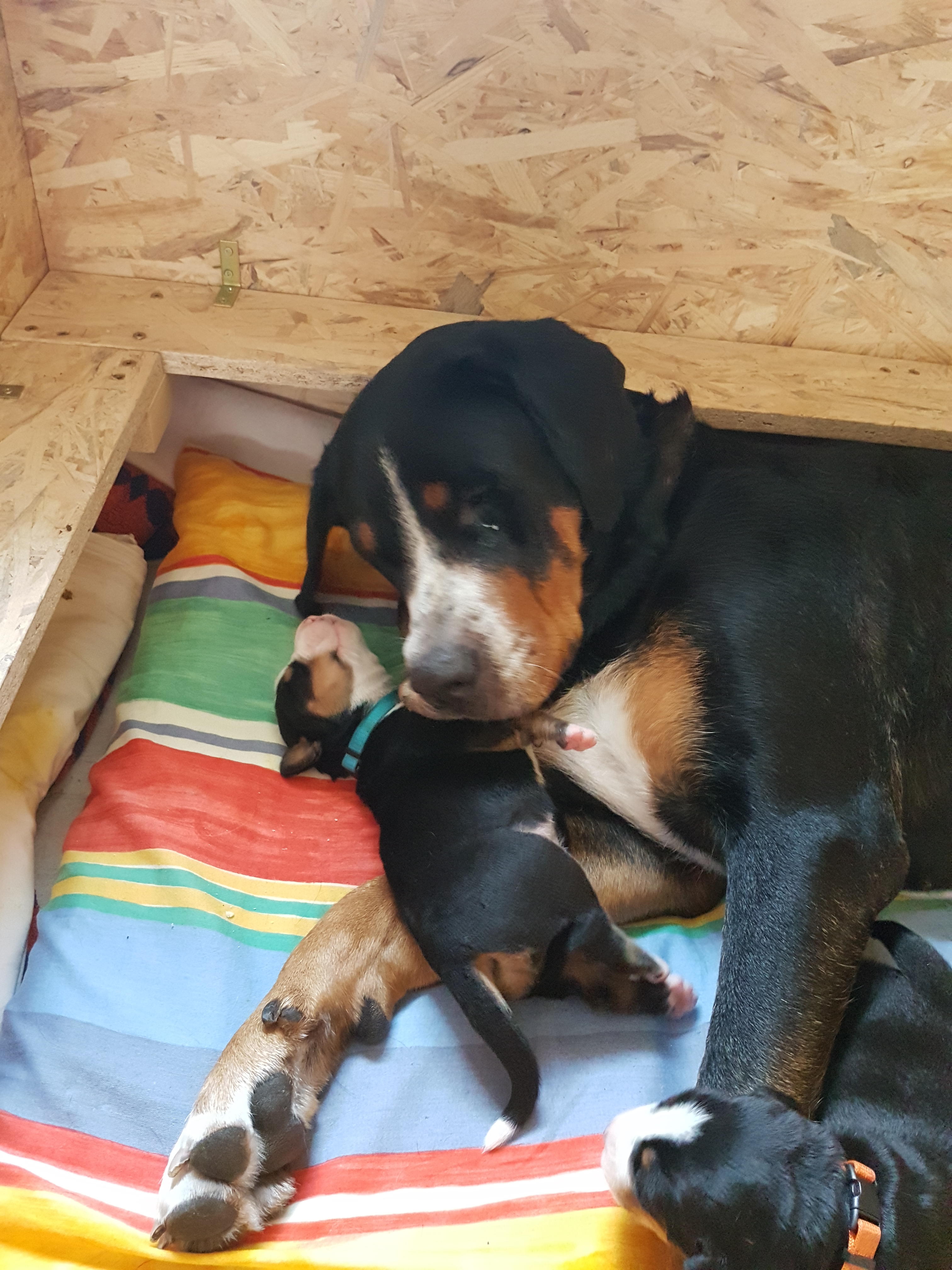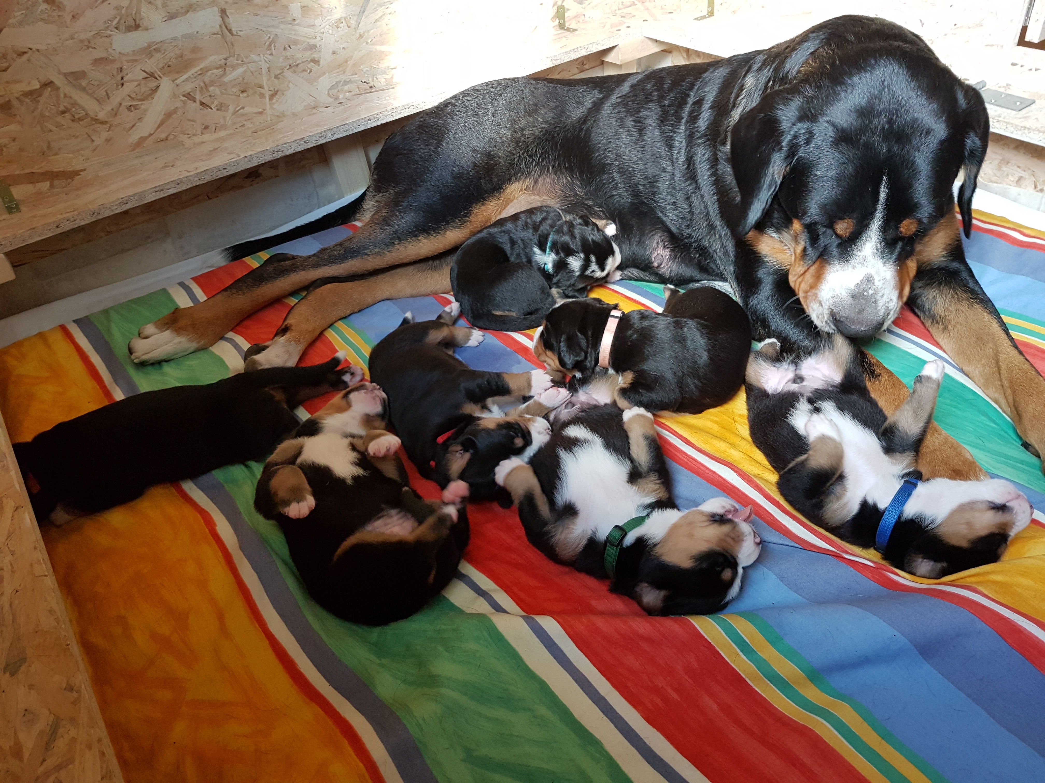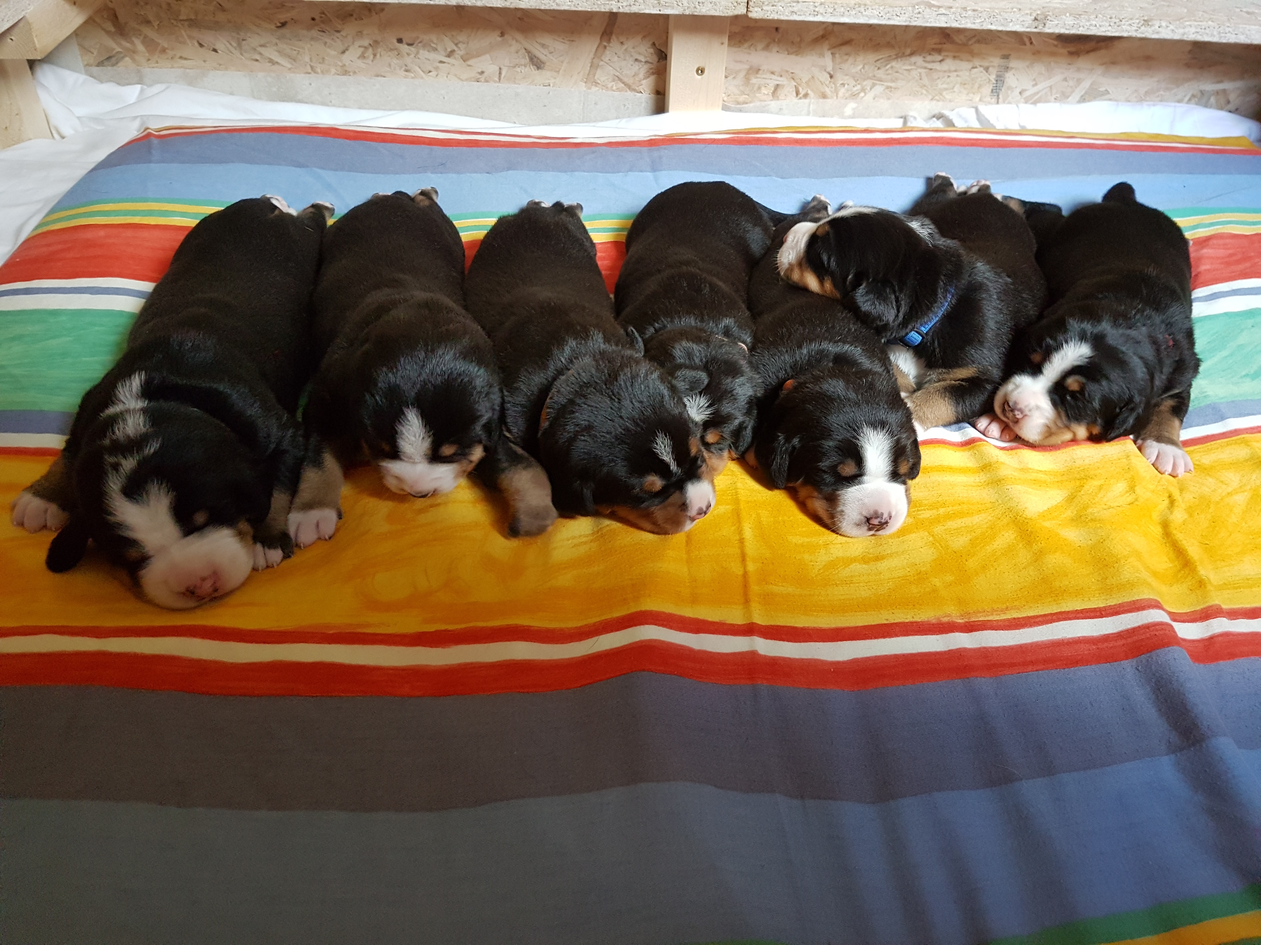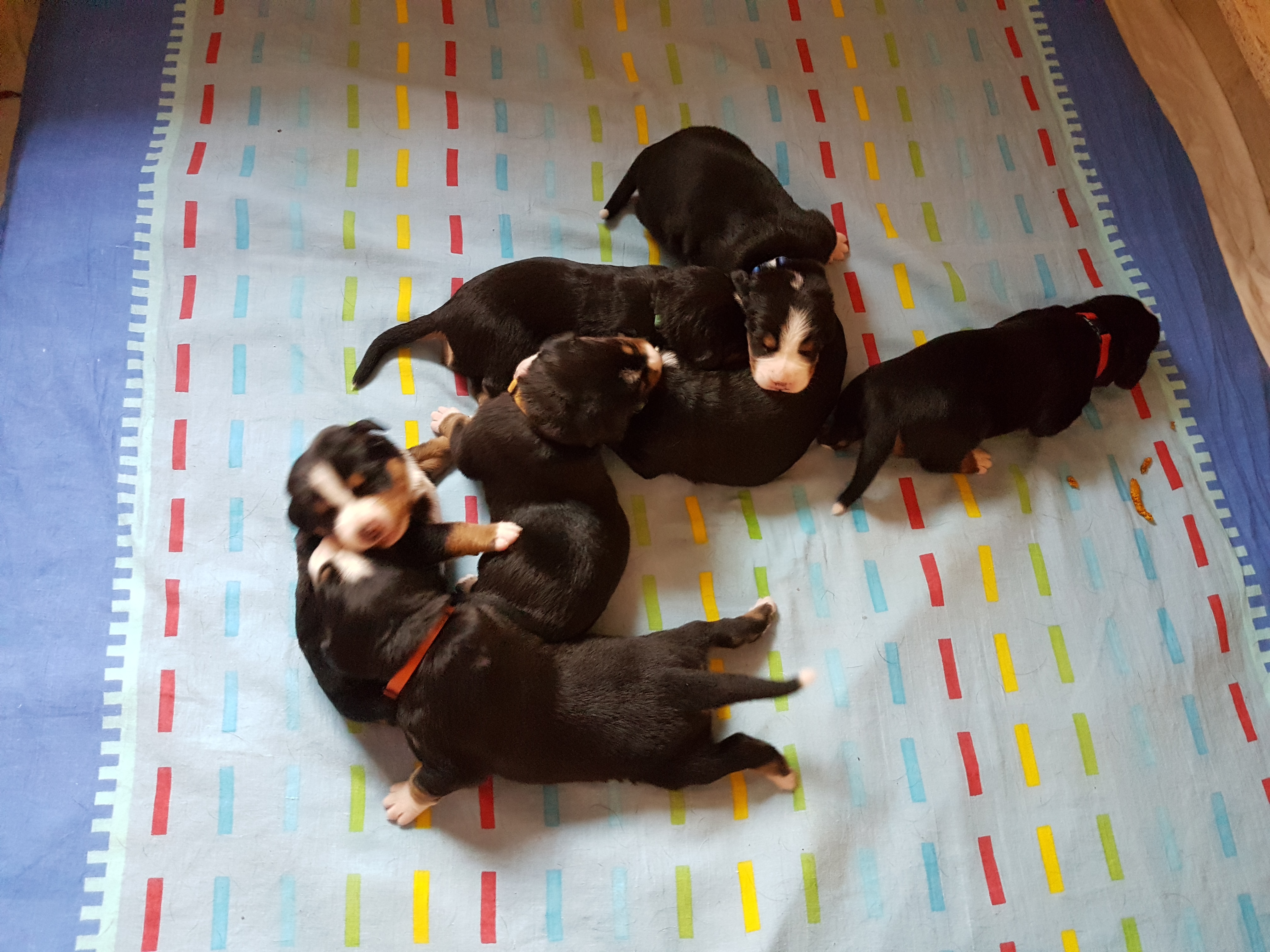 Unser A-Wurf wurde am 1. August 2017 – ausgerechnet am Schweizer Nationalfeiertag – geboren. Wie passend!!! Es war mit Sicherheit der heißeste Tag des Jahres!!! Wir haben gemeinsam mit Hedi so sehr geschwitzt! Aber daran war ja nicht nur die Hitze allein Schuld. Das Ergebnis waren 7 kleine Zwerge – die Jungs: Al-Django, Ayk Age und Artax (genannt Artoc) und die Mädchen Amy, Ana-Jzula, Arabella und Annisha. Hier folgen noch einige Fotos aus der Wurfkiste…